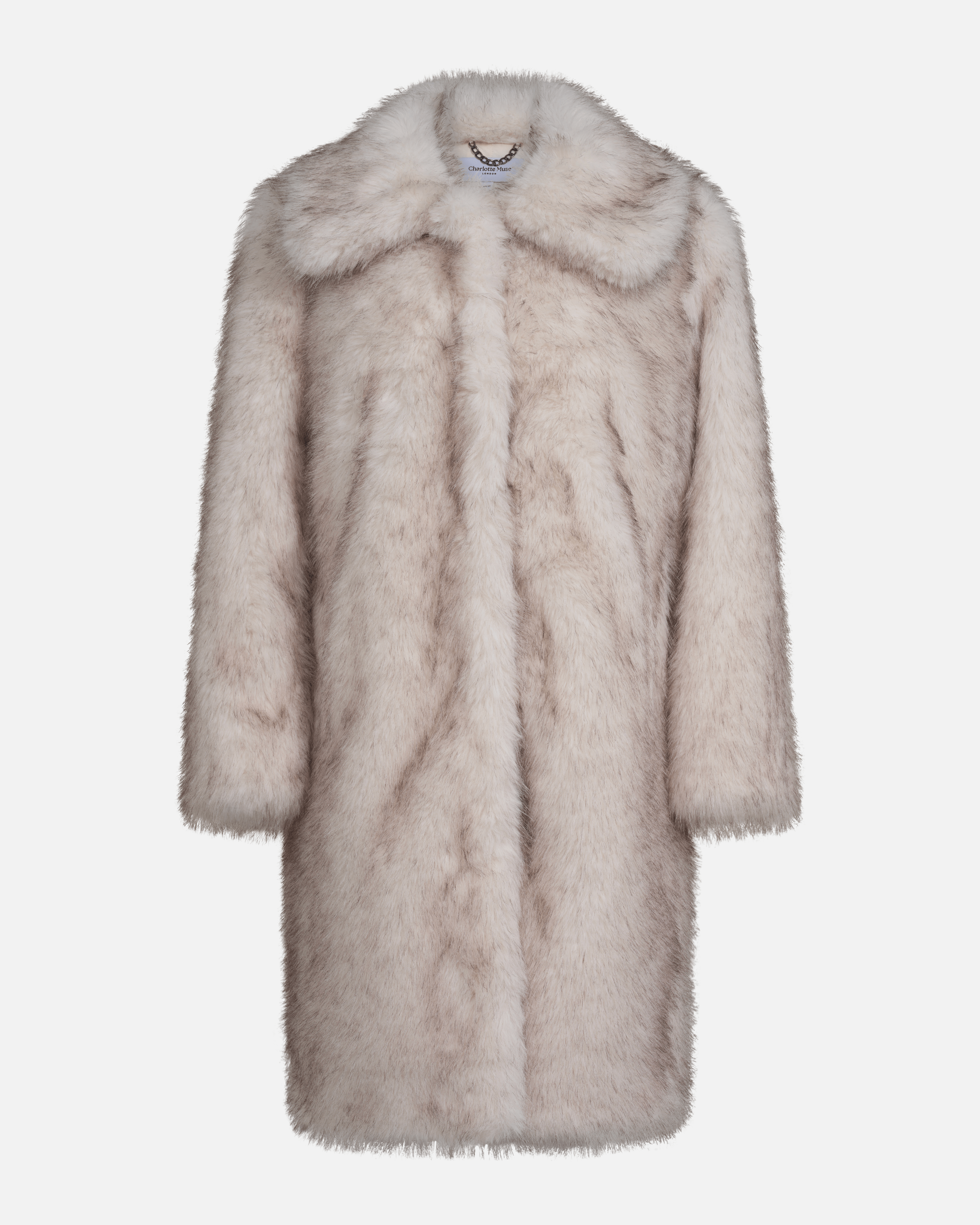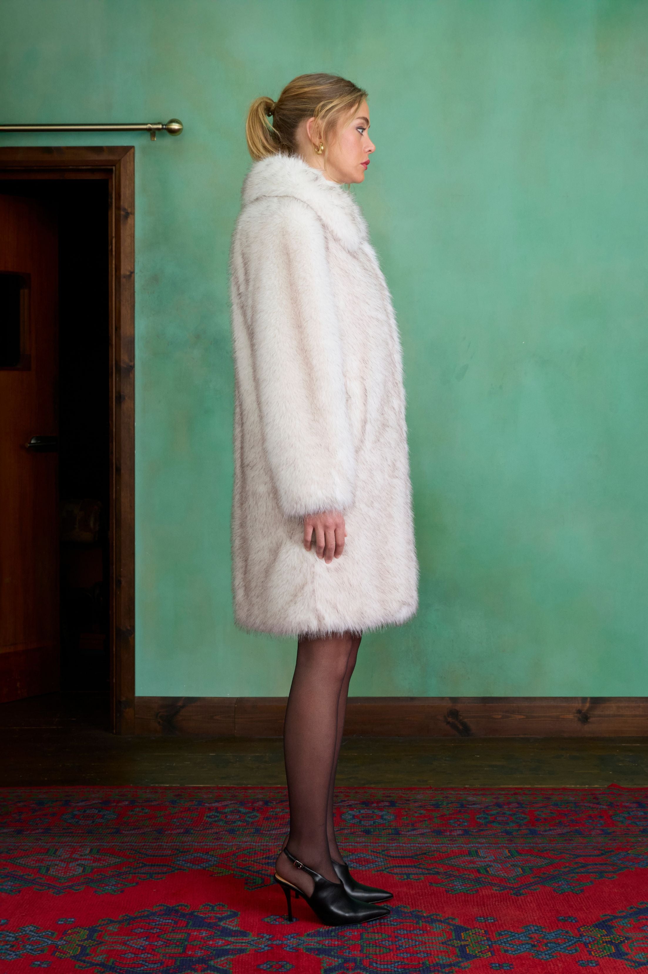 A sumptuous faux fur coat inspired by the glamour of the ’90s. Designed with a voluminous silhouette and a cloudlike texture, it feels light while offering enveloping warmth. The longline cut is complemented by an oversized collar that fastens neatly up to the neck, front hook-and-eye closures, and discreet side pockets for a refined yet practical finish.