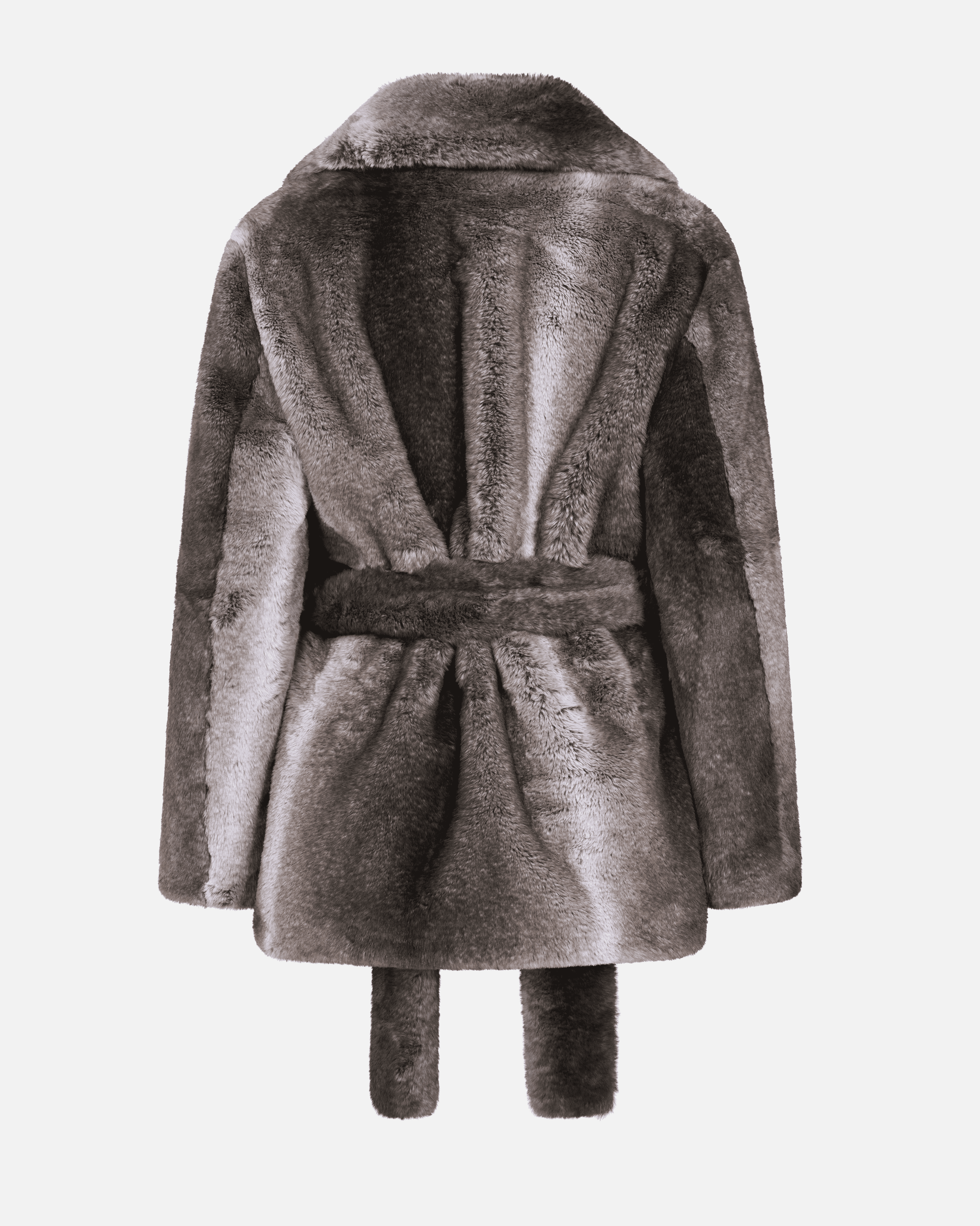 A hip-length faux fur coat with the soft, sculpted look of shearling, reimagined in plush faux fur. Defined by its tactile finish and a waist-cinching belt, this piece blends cosy texture with a softly contoured silhouette. The tie belt adds definition, as the sweeping collar nods to subtle vintage glamour.