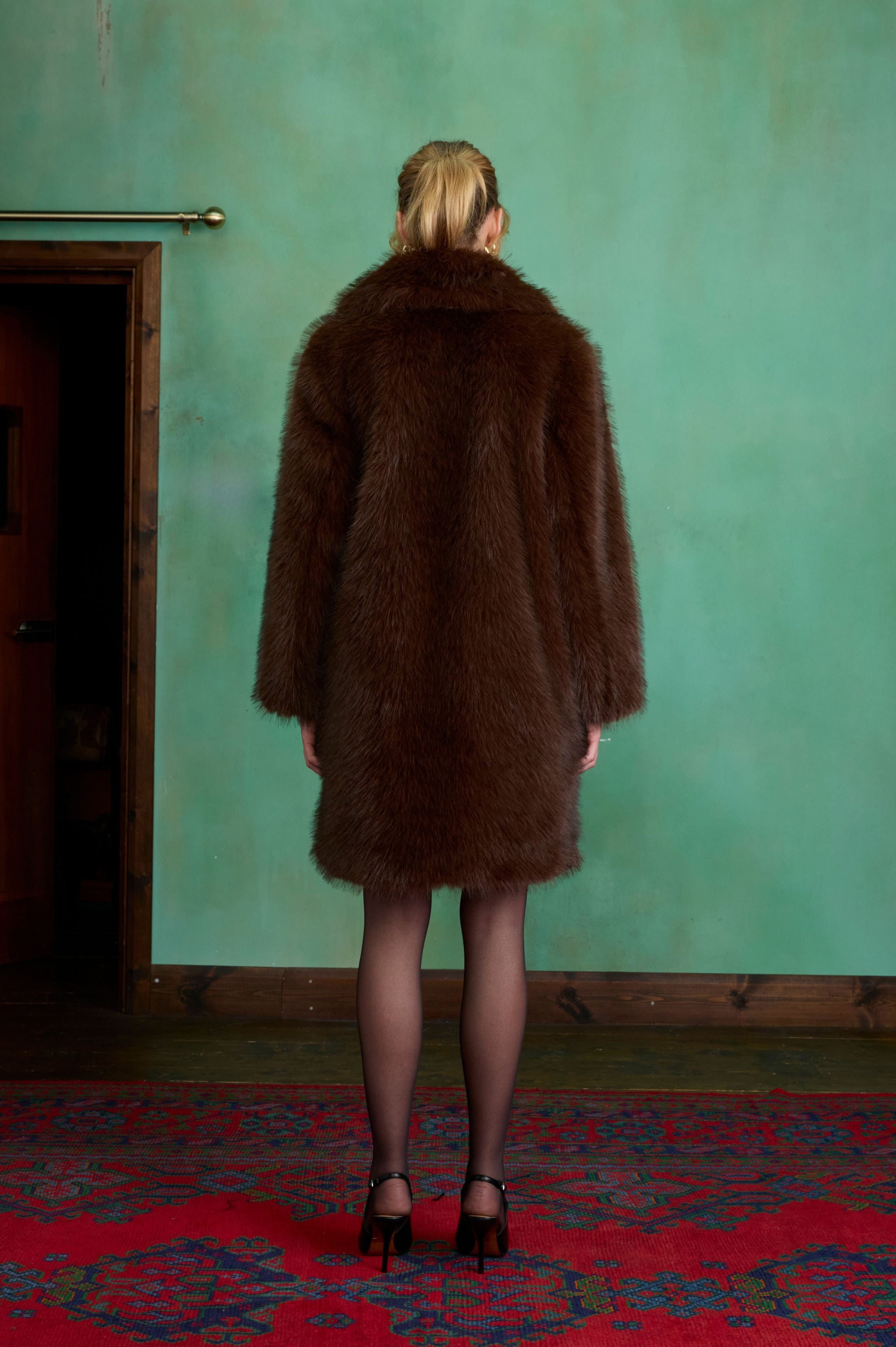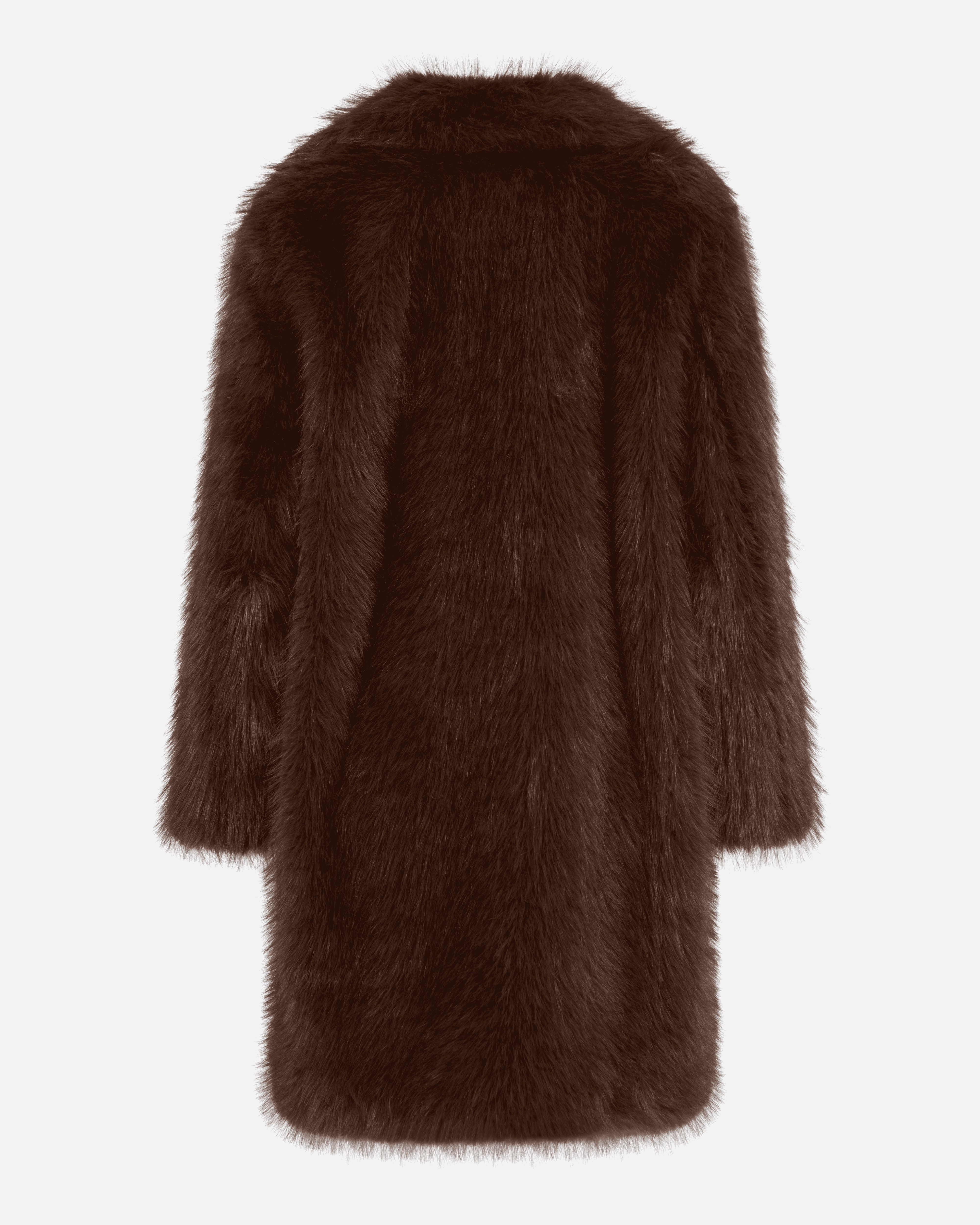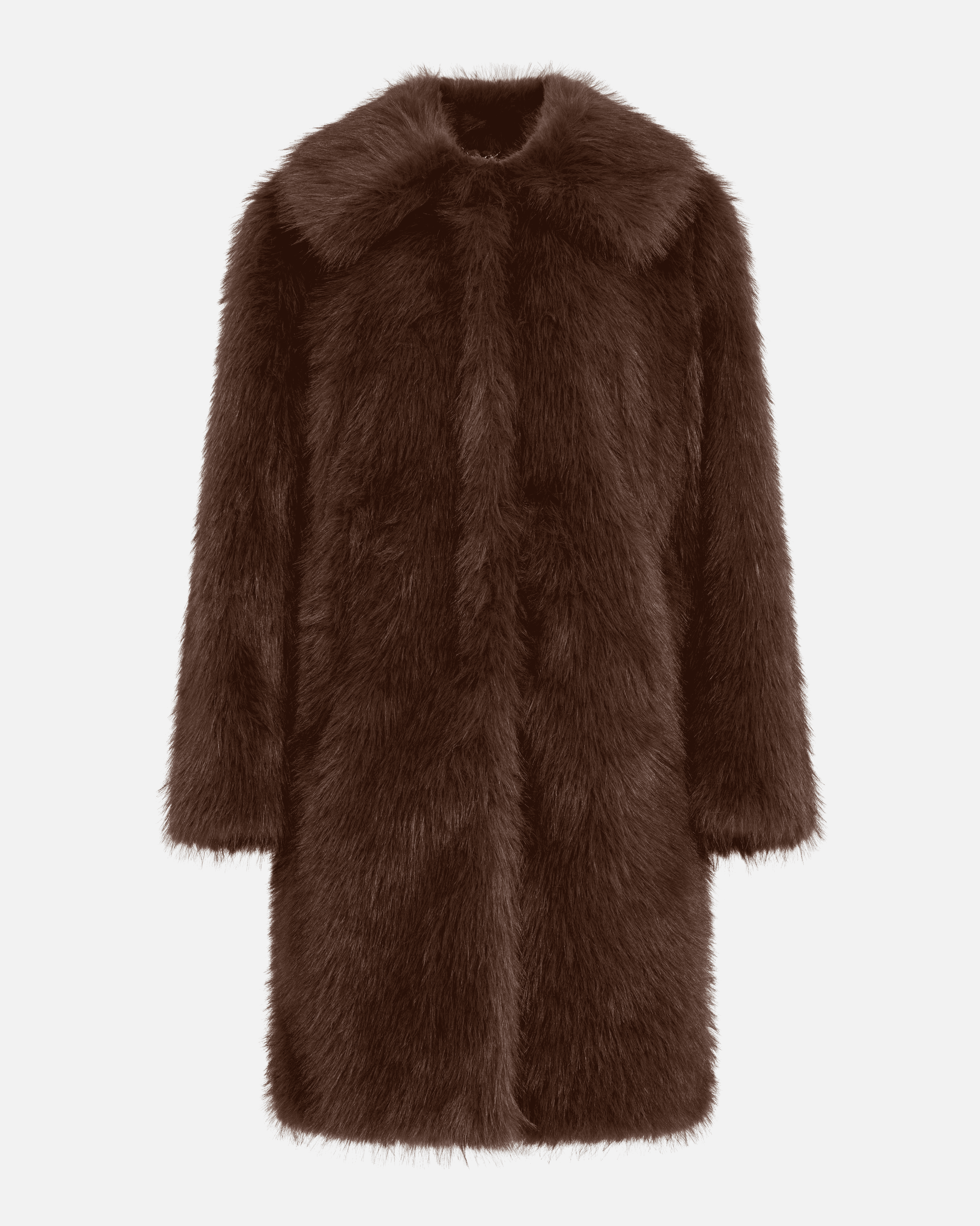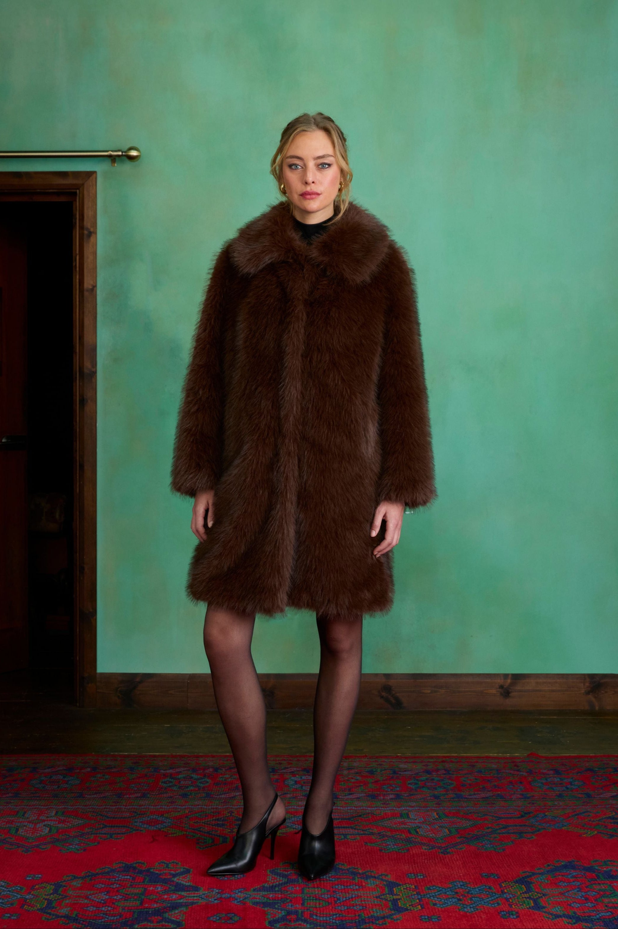 Cut from ultra-soft faux fur in the season’s key shade of brown, this long-length coat makes a refined statement. The oversized collar fastens high at the neck for added warmth, while the full-length silhouette offers both coverage and impact. A modern classic with a quietly luxurious feel.